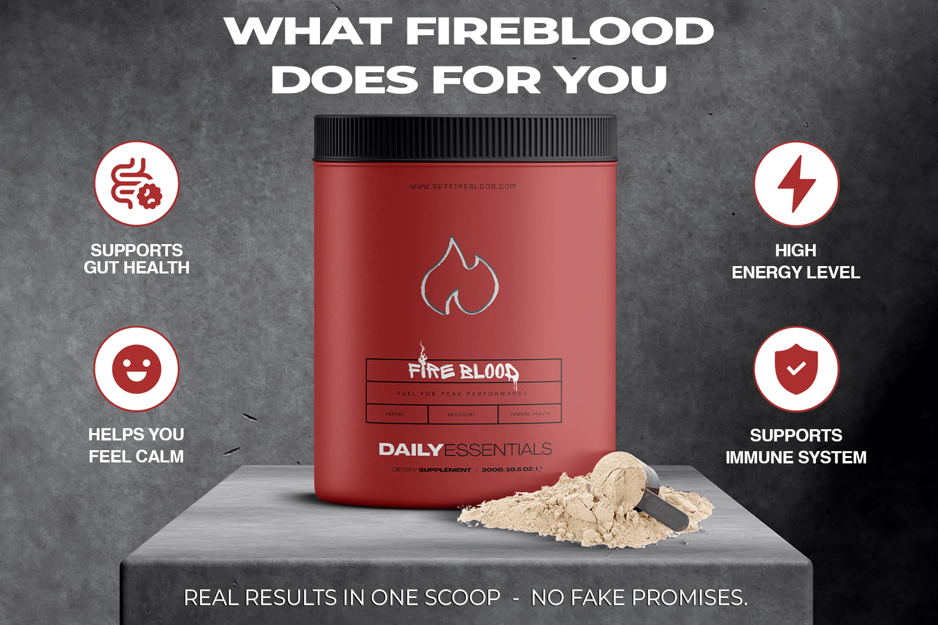 Fireblood supports mental performance, energy production, boosts heart health, and fortifies your immune system. Expect sustained energy, fewer cravings, a sharper mind, healthier skin, stronger hair & nails, and faster recovery after intense activity. Fireblood is your nutritional foundation to win.