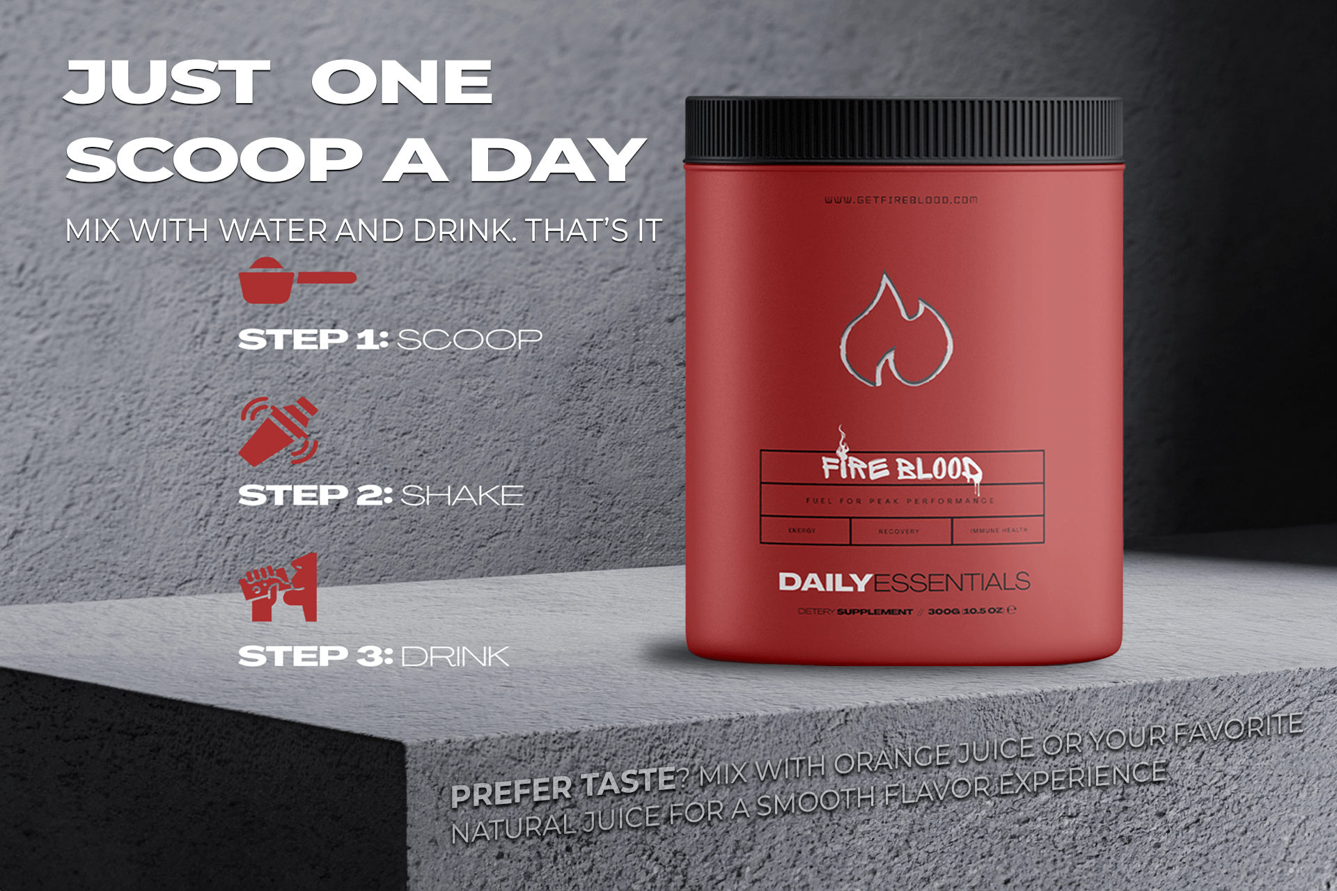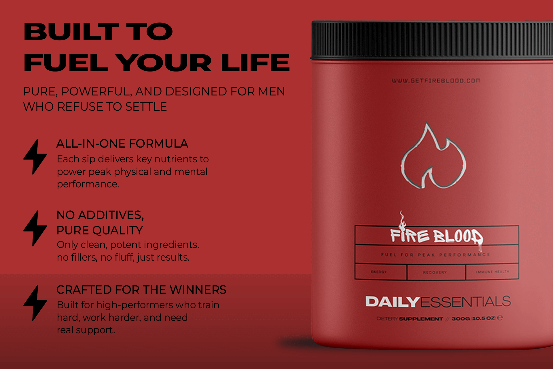 Fireblood supports mental performance, energy production, boosts heart health, and fortifies your immune system. Expect sustained energy, fewer cravings, a sharper mind, healthier skin, stronger hair & nails, and faster recovery after intense activity. Fireblood is your nutritional foundation to win.