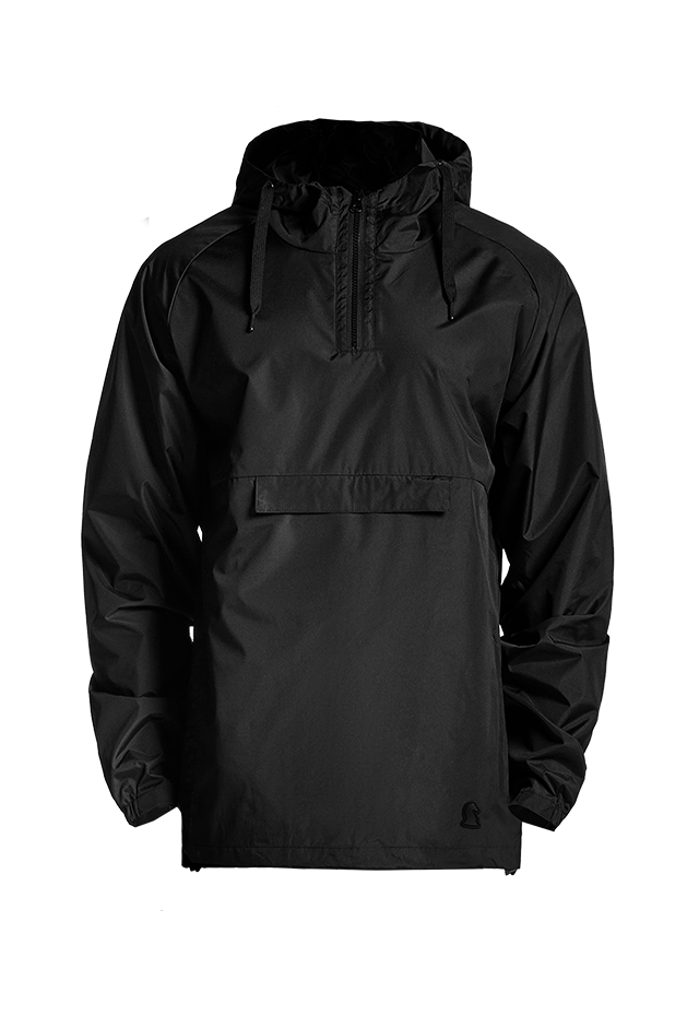 Pullover hooded windbreaker, rubber headphone patch, adjustable elastic drawcord at hem, 2 side pockets, water resistant, UPF 50, plastic tooth YKK zip AND invisible zips at pockets.